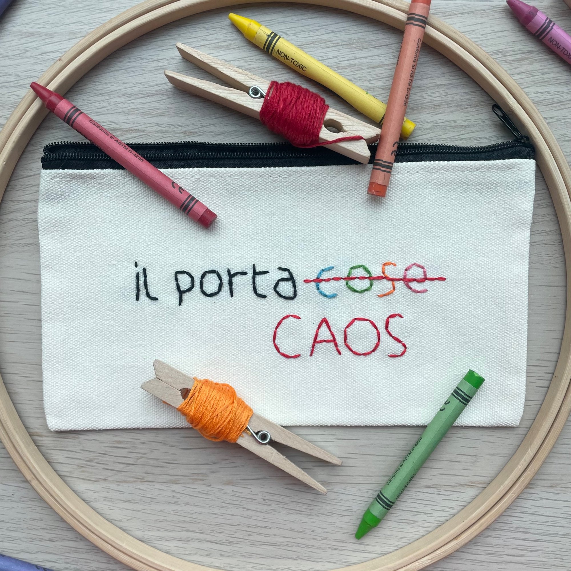 astuccio in tela con zip colorata ricamato a mano